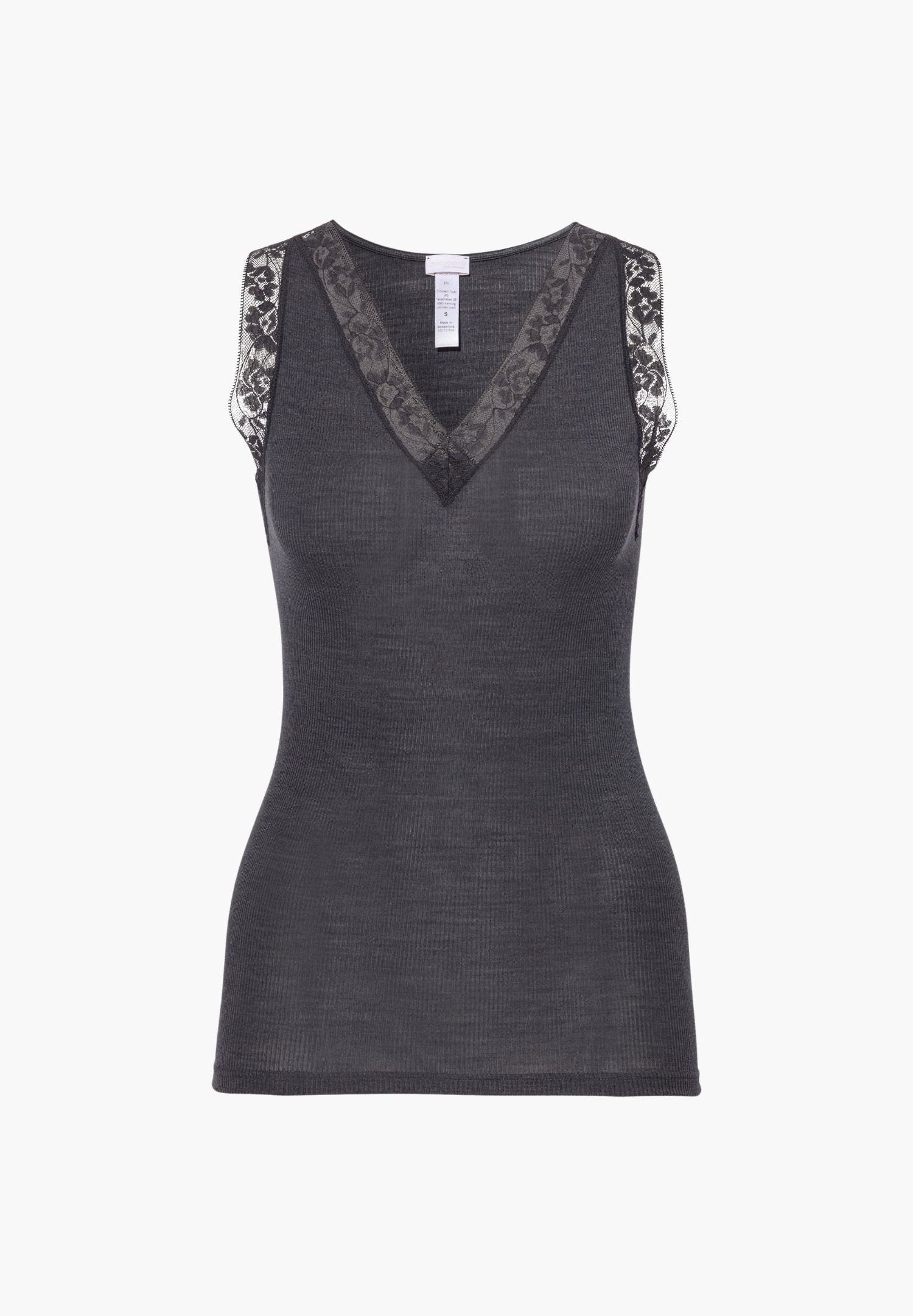 Fine rib fabric with a subtle structure and made of fine wool-silk material in a modern, straight look. The top with wide straps for women impresses with its deep round neckline set with wide edging bands. With no side seams at all, the fabric hugs your body seamlessly as it is made using the circular knitting method.
